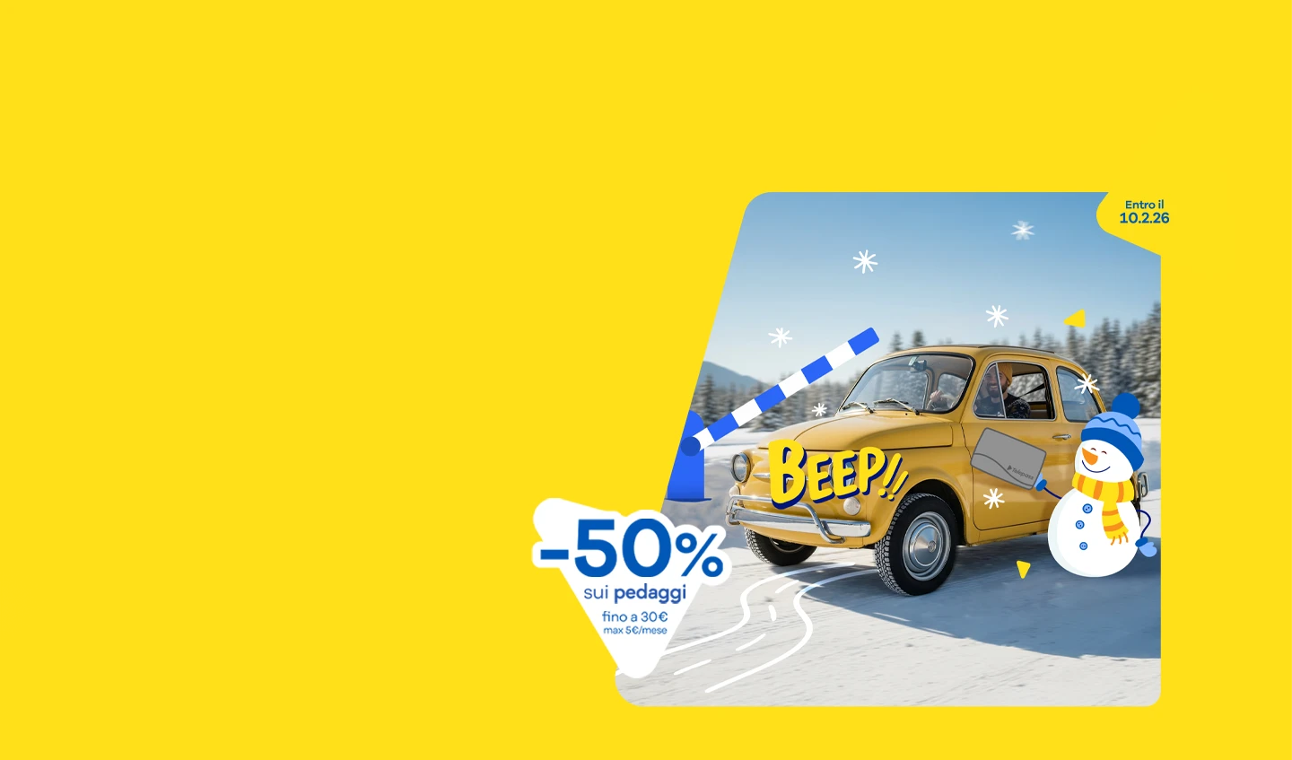 * Telepass Family, l’offerta Base di Telepass. Iniziativa "Promozione 12 mesi canone Telepass e cashback pedaggio inverno 2025 Banche" valida dal 10/11/2025 al 10/02/2026 per chi, nel periodo dell’iniziativa, sottoscrive un contratto Telepass Family presso le filiali o i canali digitali interessati dall’iniziativa. Tali clienti avranno diritto a 12 mesi di canone gratuito del contratto Telepass Family (poi 3,90€/mese) e, inserendo il codice promo 50PED, il 50% di cashback sui pedaggi effettuati in Italia con Telepass dall'01/12/2025 al 31/05/2026, erogato con un limite mensile di 5€ e con un limite complessivo di €30. Il cliente potrà ricevere un solo codice promo nell'ambito dell'iniziativa. Promo valida per coloro che non siano stati clienti Telepass Family nei 30 giorni antecedenti la data di sottoscrizione dell’offerta. Promo non cumulabile con altre iniziative ad eccezione della “Promo bundle Pacchetto Telepass Sempre 2025-2026” valida dal 01.04.2025 al 31.03.2026 per chi aderisce al Pacchetto Sempre composto dal Contratto Telepass Base e dal Contratto Servizi di Mobilità di Telepass, sconto di euro 1,24/mese sul canone del Telepass Base. Non applicabile a chi è stato cliente Telepass Plus nei 6 mesi precedenti. Offerta soggetta ad accettazione e limitazione di Telepass. Contratto e Regolamenti su www.telepass.com.