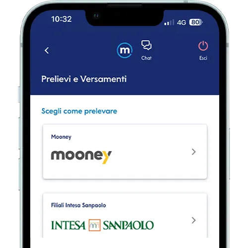 Entra nell’app nella sezione Prelievo e Versamento, scegli Mooney, aderisci al servizio (se non l’hai già fatto), genera il QR Code e mostralo insieme a un documento di identità e al codice fiscale presso il punto convenzionato scelto.